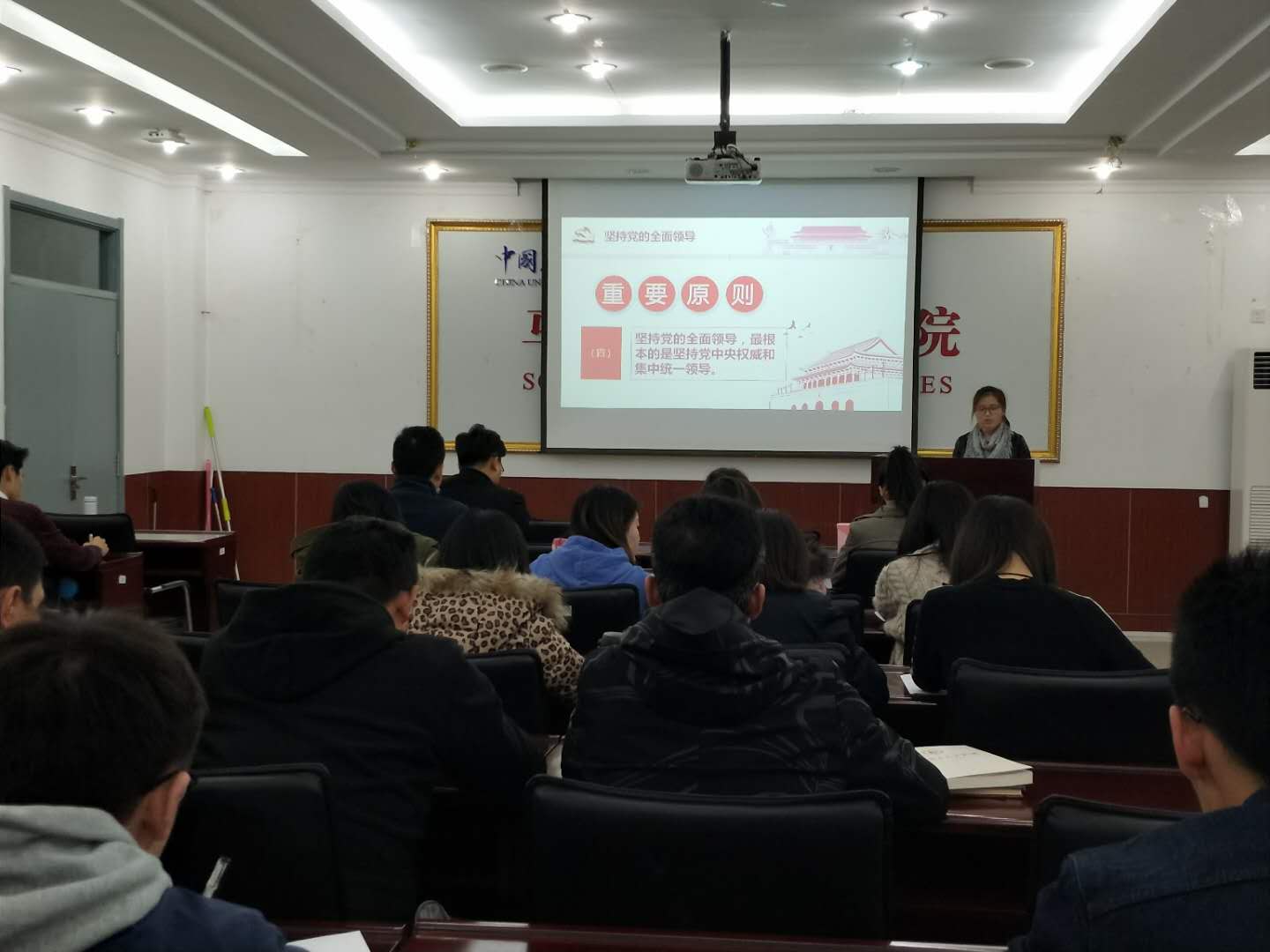 在本次博士论坛中,宋美桦以“新时代总揽全局、协调各方的党的领导体系”为论坛题目,向同学们分享她对党的十九届三中的认真解读与思考。首先,宋美桦从本次党的十九届三中全会审议通过的《中共中央关于深化党和国家机构改革的决定》出发,分析了中国共产党总揽全局、协调各方的党的领导体系。其次,她从“党的领导体系”相关概念入手,对坚持党的全面领导和深化党的领导体系改革这两方面对议题进行了一个系统的阐述。并强调了在我党工作中的重要原则是“坚持和加强党的领导”,同时强调了“党、政、军、民、学,东、西、南、北、中党是领导一切的中心”,最后,宋美桦结合自身自己马克思主义中国化的研究和对政治的敏锐感总结出了她对十九届三中全会的认识和总结,她认为作为学生尤其是马院学生应坚决维护习近平总书记党中央的核心、全党的核心地位,坚决维护党中央权威和集中统一领导。在讲座结束后,同学们也分享了自己的感受。