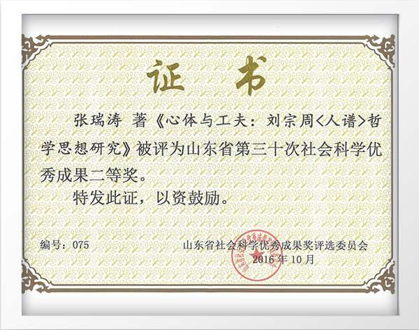 张瑞涛山东省社会科学优秀成果二等奖(心体与工夫——刘宗周《人谱》哲学思想研究)