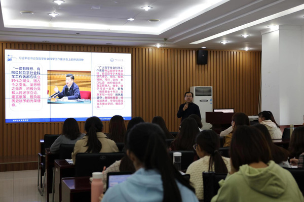 张瑞涛老师围绕着“新时代研究生的学术使命”这一主题,先是将习近平对知识分子的寄语进行解读,强调了青年人责任担当和使命意识的重要性。随后从“习近平总书记在哲学社会科学上的讲话精神、研究生学术研究的三个维度和正确处理研究生学术生活的三个关系” 三个方面进行讲解。首先从坚持和发展中国特色社会主义必须高度重视哲学社会科学、坚持马克思主义在我国哲学社会科学领域的指导地位、加快构建中国特色哲学社会科学、加强和改善党对哲学社会科学工作的指导四个问题出发,全方位剖析了习近平总书记在哲学社会科学上的讲话,张瑞涛老师强调需要广大青年知识分子学以致用,只有从人抓起、久久为功最终才能构建起中国特色哲学社会科学。其次,张瑞涛老师从“真、新、范”三个纬度强调研究生学术研究需要做到诚信、创新、规范,对研究生的学术研究提出了具体的要求。最后,张瑞涛老师深入浅出的讲解了研究生与导师的关系既远又近、既亲又疏、荣辱与共;研究生进行学习需要读与思;学术生活和日常生活需要在思维与乐趣方面进行区分,同时委身学术不等于学术毕业。张老师的一番讲解给同学们带来了深刻的启发,让同学们深入了解了学术生活和日常生活的关系。