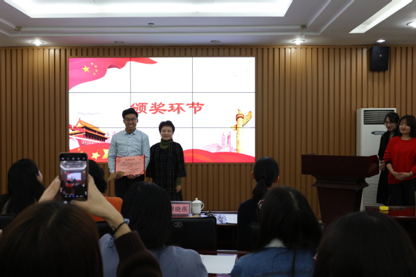 11月14日下午2点,我院在文理楼457举办了“博韵书香”系列主题教育活动之“为祖国喝彩”中华经典名篇诵读大赛,全校各学院的十支参赛队伍参加了比赛,学院党委副书记袁爱军、后备军官学院综合办公室主任杨晓静、我院解晓燕副教授、团委书记王会等应邀担任评委,我院2018级、2019级全体硕士研究生观看了比赛。
