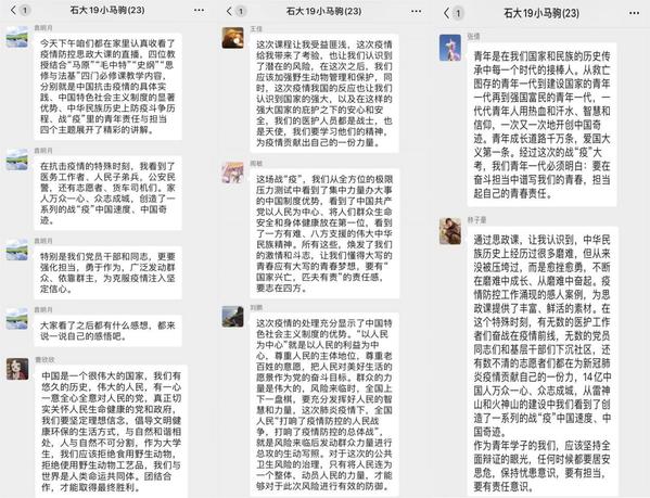 直播课程结束后,在各年级党支部书记的主持下,各年级学生在年级微信群进行了热烈的交流和讨论。学院学生党员、入党积极分子、共青团员和习近平新时代中国特色社会主义思想青年研习会成员们围绕直播内容,从多个角度分享了翔实、充分的心得体会。学生党员2018级硕士研究生盈松男同学说:“作为一名普通学生,我没有能力为前线做些什么,但能力不足不代表不作为,我们有自己的方式去表达自己的关切。面对疫情最好的抵抗不是非要社会半身不摄,不是主动营造恐慌氛围,是众志成城,重视而不泛滥,是人定胜天,积极而不大意。是青年人义愤填膺而积极向上,是青年人有心报国而各司其职。疫情,当重视不当怖惧;青年,当热血亦当理性。”2019级硕士研究生袁明月同学认为在党中央的坚强领导下,各级党组织成员强化担当、勇于作为,广泛发动群众、紧紧依靠群众,创造了一系列的战“疫”中国速度和中国奇迹。2019级硕士研究生梁硕同学认为这次疫情防控彰显了国家治理的根本优势、制度优势、效能优势和价值优势。