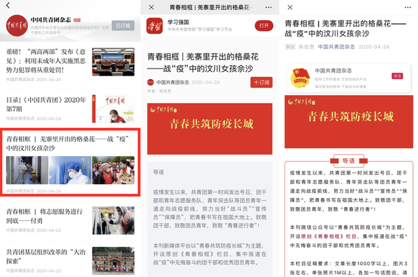 青春相框 | 羌寨里开出的格桑花——战“疫”中的汶川女孩佘沙https://article.xuexi.cn/articles/index.html?art_id=16540879655934499798&item_id=16540879655934499798&study_style_id=feeds_default&pid=&ptype=-1&share_to=wx_single&source=share&from=singlemessage