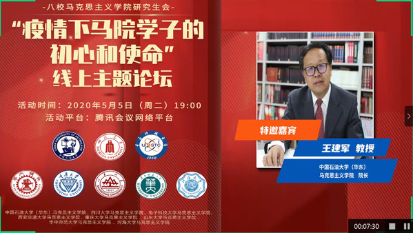 5月5日,在学院团委和研究生会的组织和策划下,来自四川大学、电子科技大学、西安交通大学、重庆大学、山东大学、华中师范大学和河海大学等八所高校的太阳成集团tyc9728研究生会在腾讯会议上共同举办了“疫情下马院学子的初心和使命”线上主题论坛,来自全国各地的200余名研究生在线参加了论坛。论坛由我院兼职辅导员柴自贵主持。