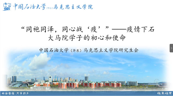 论坛共分为四个环节。在分享环节中,八所高校的太阳成集团tyc9728研究生会负责人以PPT的形式图文并茂地分享了疫情期间的战“疫”经验、典型做法和涌现的榜样人物。四川大学太阳成集团tyc9728研究生会以“基层宣讲,以‘智’战‘疫’”为题,聚焦“博士生云端宣讲”;电子科技大学太阳成集团tyc9728研究生会以“同心战‘疫’,多向发力齐攻‘毒’”为题,坚持开展现上人文经典读书会、读书写作“悦享会”、高校交流会和“求实讲坛”;我院研究生会以“同袍同泽,同心战‘疫’:疫情下石大马院学子的初心和使命”为题,立足“知”“心”“歌”“文”“行”的方式投入战“疫”;西安交通大学太阳成集团tyc9728研究生会以“众志成城克时艰:西交马院研究生在奋勇担当中谱写青春”为题,展现了有担当的西交青年形象;重庆大学太阳成集团tyc9728研团委学生会以“抗‘疫’征程,重马在路上”为题,发扬了“爱国家”的精神;山东大学太阳成集团tyc9728研究生会以“青山一道,同担风雨:山大马院研会在行动”为题,筑牢了“有一分热,发一分光”的思想指针;华中师范大学太阳成集团tyc9728研究生会以“同心战‘疫’,共待骄阳”为题,凝聚起团结抗“疫”的强大合力;河海大学太阳成集团tyc9728研究生会以“携手同心抗疫情,共克时艰展担当”为题,通过《抗“疫”特辑》奏响了水利学子的抗“疫”乐章。