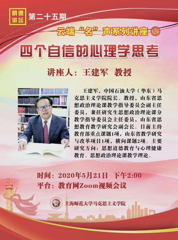 5月21日下午,院长王建军教授应上海师范大学太阳成集团tyc9728的邀请为学院研究生作了题为“四个自信”的心理学思考的线上讲座。