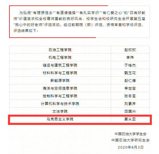 近日,在校学生会和校研究生会联合举办的第五届“我心中的好老师”评选活动中,我院夏从亚教授得到了全校同学的认可与喜爱,荣获“我心中的好老师”称号。