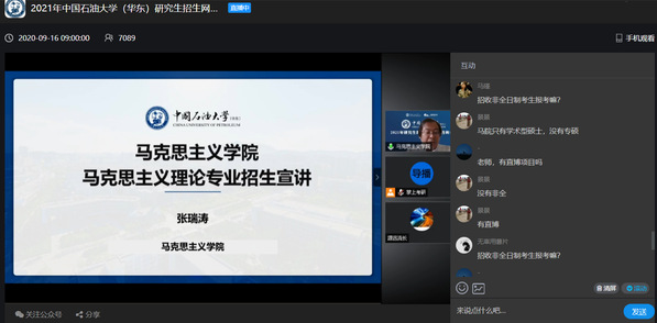 宣讲会期间,张瑞涛教授就学院的发展概况、学科方向、导师团队、科研平台、招生政策、培养特色、就业情况等研究生招生信息进行了详细的介绍,对学院马克思主义理论专业研究生培养情况进行了全方位的讲解。同时,对2021年有意报考我院研究生的同学们所提出的问题进行答疑解惑,学院党委副书记袁爱军、教学秘书景艳菊也在直播间互动区、线上推免QQ群中在线回答学生疑问,以帮助外校同学更加深入了解学院情况。