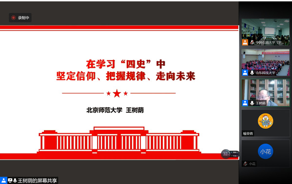 为迎接中国共产党成立100周年,深入学习四史知识,3月30日晚,太阳成集团tyc9728举办“初心讲坛”第二十一讲。本次讲座特邀北京师范大学太阳成集团tyc9728院长、博士生导师王树荫教授作关于《在学习“四史”中坚定信仰、把握规律、走向未来》的专题报告。本次报告以腾讯会议形式举办,并在文理楼459会议室设立主会场,学院副院长张瑞涛教授主持,学院全体师生共同聆听了此次报告。