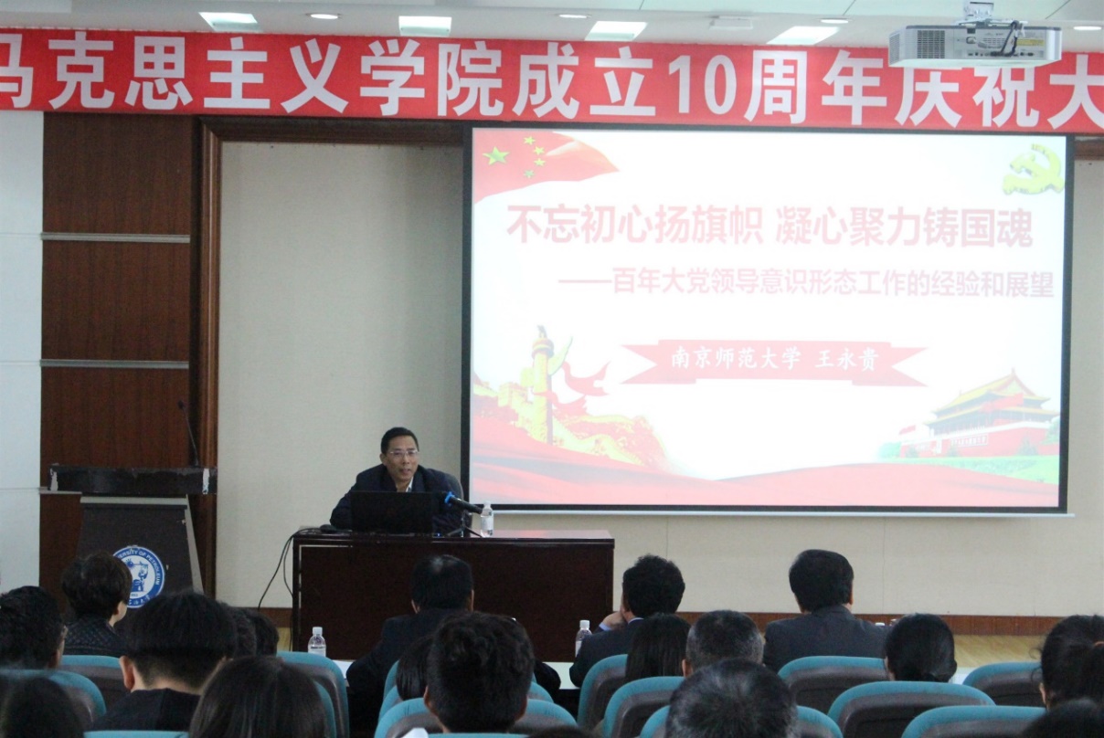 同时,作为太阳成集团tyc9728成立10周年庆祝活动的组成部分,学院邀请了南京师范大学教授、“长江学者”王永贵教授作了题为“不忘初心扬旗帜 凝心聚力铸国魂——百年大党领导意识形态工作的经验和展望”的学术报告。