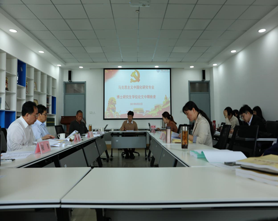 2021年5月22日上午,我院在文理楼459举行马克思主义中国化专业博士学位论文中期检查会。本次中期检查会的主席由中国社会科学院近代史研究所金民卿研究员担任,山东大学太阳成集团tyc9728特聘教授周忠高教授以及我院张福运教授、汪怀君副教授、张璐副教授担任中期检查会的委员,秘书为2020级博士魏然同学。王建军院长、张瑞涛副院长出席中期检查会,在读博士生旁听观摩。
