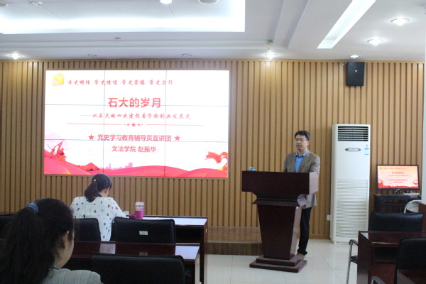 宣讲开始前,王会老师介绍学校为迎接建党百年、讲好党史而打造的党史学习教育辅导员宣讲团。赵振华老师以《石大的岁月》为题,以学校发展为线索,讲述以油为生的石油大学响应国家号召、为祖国献石油的故事。首先,讲述正值第一个五年计划之际,北京石油学院于京郊荒滩、建立院系的历史。其次,讲述“文革”结束,华东石油学院恢复教学秩序,深入学科建设、人才培养、产学研结合发展,为国家石油建设输入大批人才。接着,立足当前中国石油大学青岛校区的发展,展望了古镇口校区的发展。宣讲以教育部部长陈宝生的话——“历史应该记住石大做出的贡献”结语,激励同学传承石大奋斗精神。