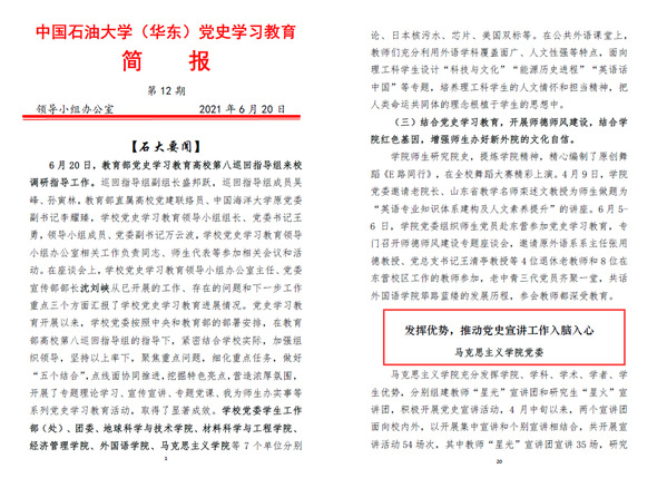 6  20 日,教育部党史学习教育高校第八巡回指导组来校调研指导工作,我院等7个单位分别汇报了本单位党史学习教育的典型经验。巡回指导组副组长盛邦跃,教育部直属高校党建联络员、中国海洋大学原党委副书记李耀臻,对我院“星光”“星火”宣讲团开展的宣讲工作予以高度评价。学校党史学习教育简报第12期,以《发挥优势,推动党史宣讲工作入脑入心》为题,专门刊登了我院开展党史宣讲工作的经验。