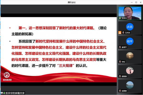 12月4日晚7点,概论教研室党支部通过腾讯会议集体学习党的十九届六中全会精神。本次集体学习邀请张荣华教授主讲,概论党支部全体教师参加。讲授主要分为两大阶段:第一阶段对十九届六中全会通过的《决议》进行解读;第二阶段立足六中全会精神,对如何做好教学与科研进行了研讨。