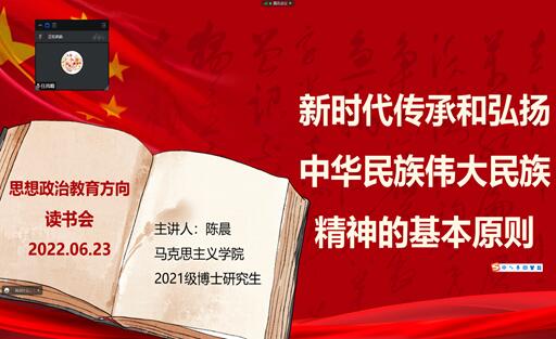 6月23日上午,思想政治教育方向读书会由班主任宋霞老师主持召开。本次读书会依托博士研究生“青蓝”线上学术论坛,围绕2021级博士生陈晨的学术汇报主题《新时代传承和弘扬中华民族伟大民族精神的基本原则》展开交流探讨,2021级全体硕士生在线参与讨论。