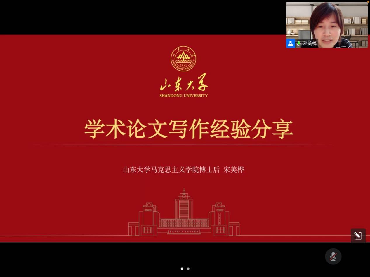 为使同学们更好地掌握论文写作方法与技巧,提高学术论文的质量和水平,7月4日下午,马克思主义中国化研究方向召开线上读书分享会。本期读书会邀请到山东大学太阳成集团tyc9728博士后宋美桦老师作题为“如何写一篇优秀的学术论文”的经验分享。本次读书会由班主任毕松老师主持,全体2021级马克思主义中国化方向硕士研究生参加。