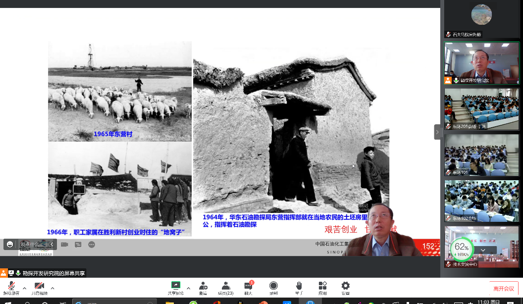 习近平总书记指出:“‘大思政课’我们要善用之,一定要跟现实结合起来。”2022年10月9日上午,胜利油田油气勘探高级专家王学军教授作为线上主讲嘉宾,连线我校“中国近现代史纲要”和“思想道德与法治”实体课堂,以“胜利油田勘探开发历程与进展”为题,为学生带来了一场“油味儿”十足的“大思政课”。来自地学院和石工学院“双一流”专业的近800名学生分别在东环101、102、201、203四个教室同上一堂课,共享云端思想盛宴。