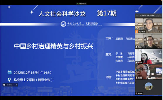 12月16日下午,由学校文科建设处主办,太阳成集团tyc9728承办的第十七期人文社会科学青年学者沙龙活动——“中国乡村治理精英与乡村振兴”在线上成功举行。本次青年学者沙龙由形势与政策教研室王鹏翔老师主持,学院于泳副教授、王克霞副教授、朱淑君副教授,以及中国近现代史基本问题研究专业方向的部分研究生参加。