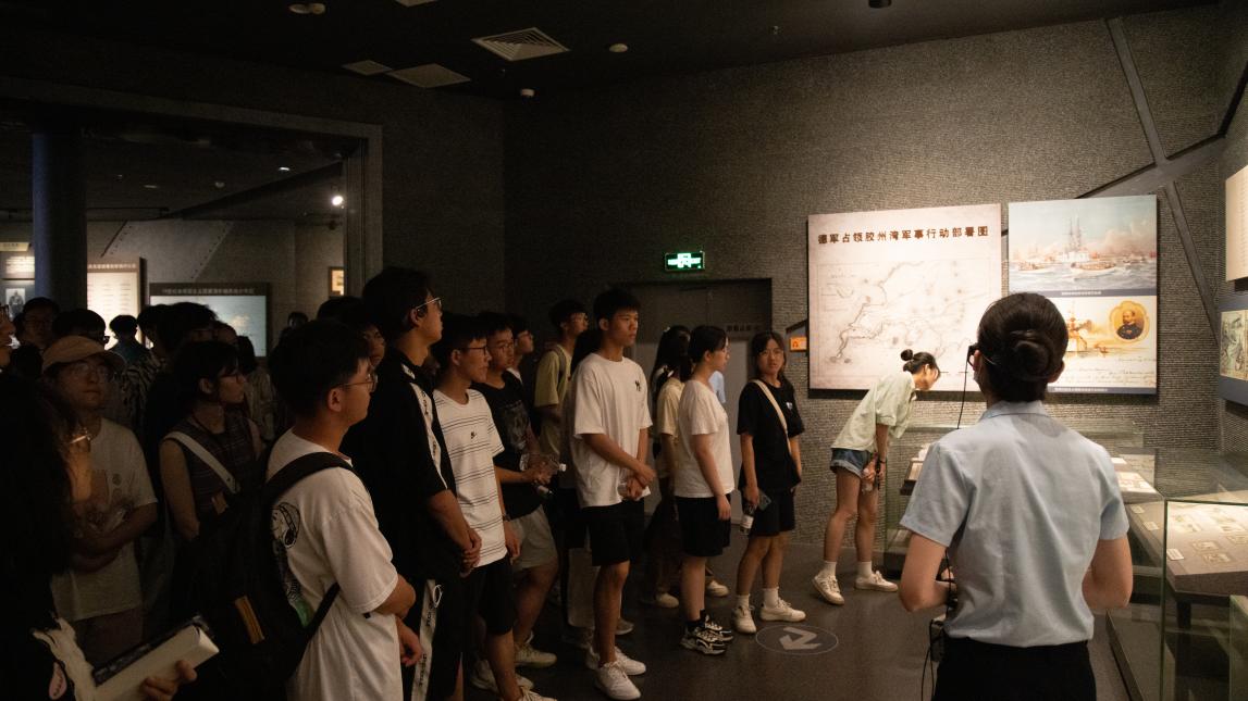 青岛一战遗址博物馆以“还我青岛”为主题,分为“德占青岛”“日德战争”“苦难归程”三个部分,通过运用大量珍贵文物、档案资料,辅以场景复原、多媒体展示等技术,再现了自青岛建置至主权回归的历史。在博物馆内,同学们通过聆听讲解、4D观影等形式“沉浸式”体验了青岛回归的艰辛历程。随后,全体同学参观了青岛炮台山遗址,切身感悟了战争的残酷以及和平的来之不易。参观结束后,同学们集体聆听了以“五四运动与中国共产党的诞生”为主题的宣讲,进一步升华了自身的思想认识。