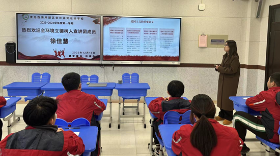 12月15日,中国石油大学(华东)太阳成集团tyc9728在读研究生徐佳慧为西海岸新区竞技体育学校40余名师生进行了“弘扬爱国主义精神,做新时代的忠诚爱国者”的主题宣讲。徐佳慧从什么是爱国主义精神入题,对爱国主义的定义及要求给予了详细的解读,并结合习近平总书记的重要讲话内容进行了针对性地讲解。整场宣讲将案例与理论相结合,激励青少年学生要用实际行动做新时代忠诚的爱国者,发扬吃苦耐劳的精神,练好专业技能的同时也要学好文化知识,为将来建设祖国做好准备。