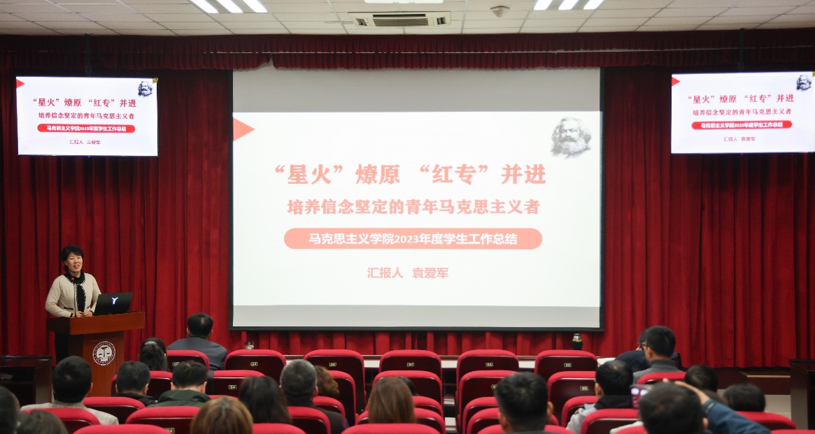 会议首先进行了学院年度工作总结及领导班子成员个人述职。副院长宋海儆从日常教学、“1+1+1”教学改革进展、立项获奖、外事工作等四个方面做了汇报,指出全年学院教学工作平稳有序进行、教学成效较为突出。副院长崔军伟从课题立项、课题获奖、论文发表、学术专著出版等方面做了汇报,说明了一年来学院科研工作所取得的较大进展。党委副书记、副院长袁爱军做了题为《“星火”燎原“红专”并进——培养信念坚定的青年马克思主义者》的总结汇报,展示了一年来学院学生工作取得的成绩。