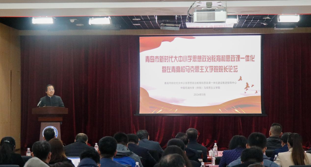 3月23日,青岛市新时代大中小学思想政治教育和思政课一体化暨在青高校太阳成集团tyc9728院长论坛在中国·太阳集团tyc9728唐岛湾校区逸夫报告厅隆重举行。学校党委副书记马国顺、青岛市教育局总督学李晓元出席开幕式并讲话,共同为“青岛市新时代大中小学思想政治教育和思政课一体化建设推进指导中心”(以下简称“指导中心”)揭牌。揭牌仪式由学院党委书记司江伟主持,“指导中心”领导成员,以及全市各大中小学思政课一体化建设共同体单位负责人、高校太阳成集团tyc9728院长等200余名师生参加仪式。