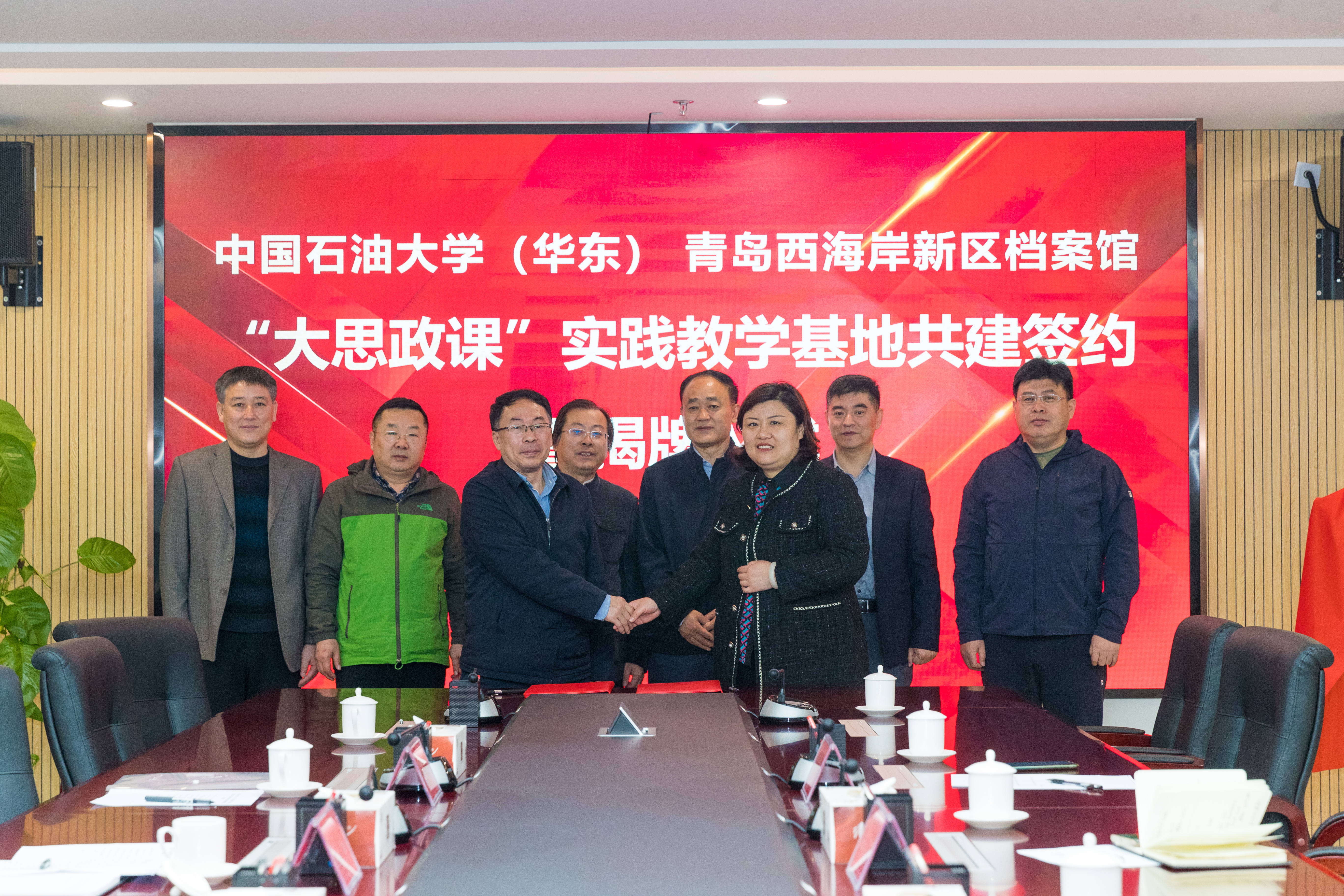 蒋晓磊副馆长对西海岸新区档案馆的基本情况作介绍,表示希望以此为契机,将新区优质的档案资源转化为高质量的教学资源,通过沉浸式体验、互动化传播、数字化赋能等多元化方式,强化档案馆的宣传教育功能,打造思政课堂品牌,助力“大思政课”的体系建设,为思政课实践教学提供有力保障,切实发挥好档案工作“存史、资政、育人”的重要作用。同时,借助中国·太阳集团tyc9728的优质品牌,馆校双方进一步增进交流、深化合作、相互促进,共同推动红色档案资源的挖掘保护、开发利用和资源共享,携手开创馆校合作共建的新局面。张瑞涛院长指出,实践基地建立后,双方将围绕着实践研学与教学资源的开发、“大思政课”师资队伍建设、高水平科学研究等相关内容来加快构建“大思政课”的工作格局,以档案馆丰富的馆藏资源为依托,聚焦西海岸发展的伟大变革,结合学校特色,开发“场馆里的思政课”,形成有青岛地域特色的大思政课教学成果。