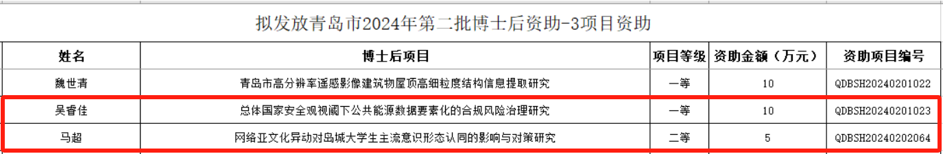 此前,我院博士后吴睿佳(文法学院教师)申报的《总体国家安全观视阈下公共能源数据要素化的合规风险治理研究》和马超申报的《网络亚文化异动对岛城大学生主流意识形态认同的影响与对策研究》获批青岛市2024年第二批博士后资助项目。