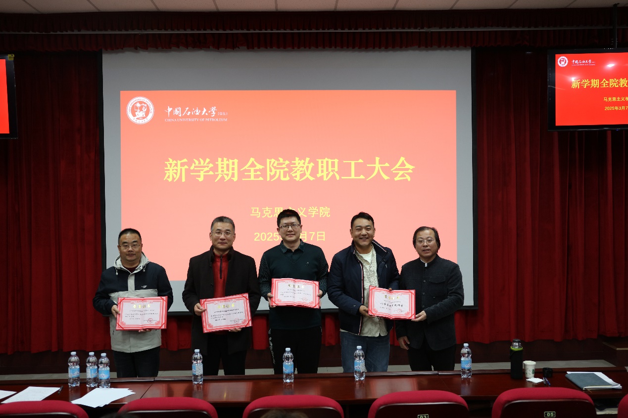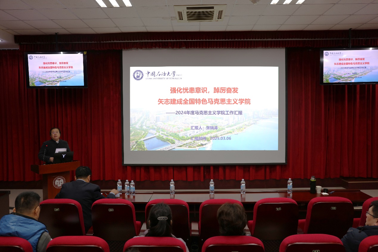 会议第一阶段,张瑞涛院长对学院2024年度工作进行总结并对2025年工作作总体安排,并传达学习上级关于思政课建设的相关文件。他指出,在学校党委的正确领导下,全院上下团结协作,实现了学院“十四五”规划关键指标的突破。同时,他强调全院上下务必戒骄戒躁,常怀忧患意识,接续奋斗,追求卓越;要系统谋划学院“十五五”发展蓝图,踔厉奋发,力争跻身首批“全国特色马院”行列。随后,张瑞涛院长为获评2024 年度考核优秀的教研室及党支部颁发荣誉证书,鼓励全院上下向优秀单位学习,营造比学赶超的良好氛围。