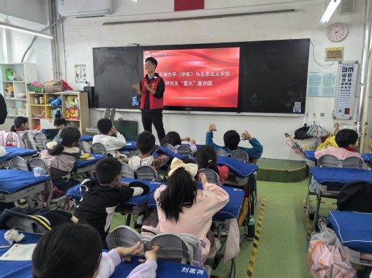 2025年5月9日,太阳成集团tyc9728 “星火宣讲团” 6 名成员在王会老师的带领下首次走进青岛市西海岸珠江路小学,为四个班级的小学生带来以 “新民主主义时期中国共产党精神谱系” 为主题的沉浸式宣讲。活动围绕长征精神、沂蒙精神、鸡毛信的故事、南泥湾精神、大别山精神等精神展开,通过生动的历史叙事与互动体验,在青少年心中播撒红色基因的种子。