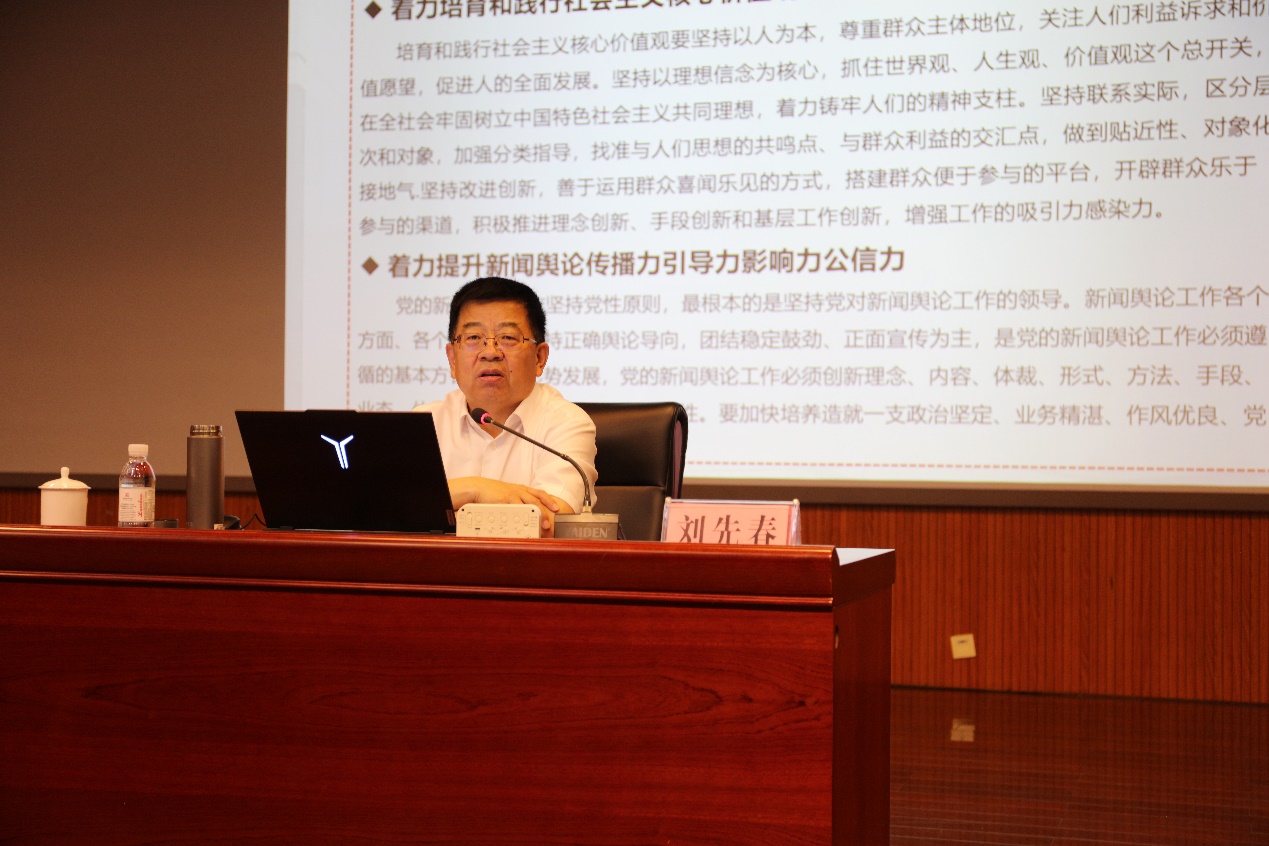 讲座伊始,刘先春教授从全局视角出发,系统阐述了习近平文化思想在新时代宣传思想文化工作中的重要地位与深远意义。他指出,习近平文化思想具有鲜明的政治性、思想性和指导性,更为新时代中国特色社会主义文化建设提供了科学指南和行动纲领。这一思想体系不仅是党中央从全局和战略高度作出的系统谋划和部署,更是推动新时代宣传思想文化事业取得历史性成就的关键所在。
