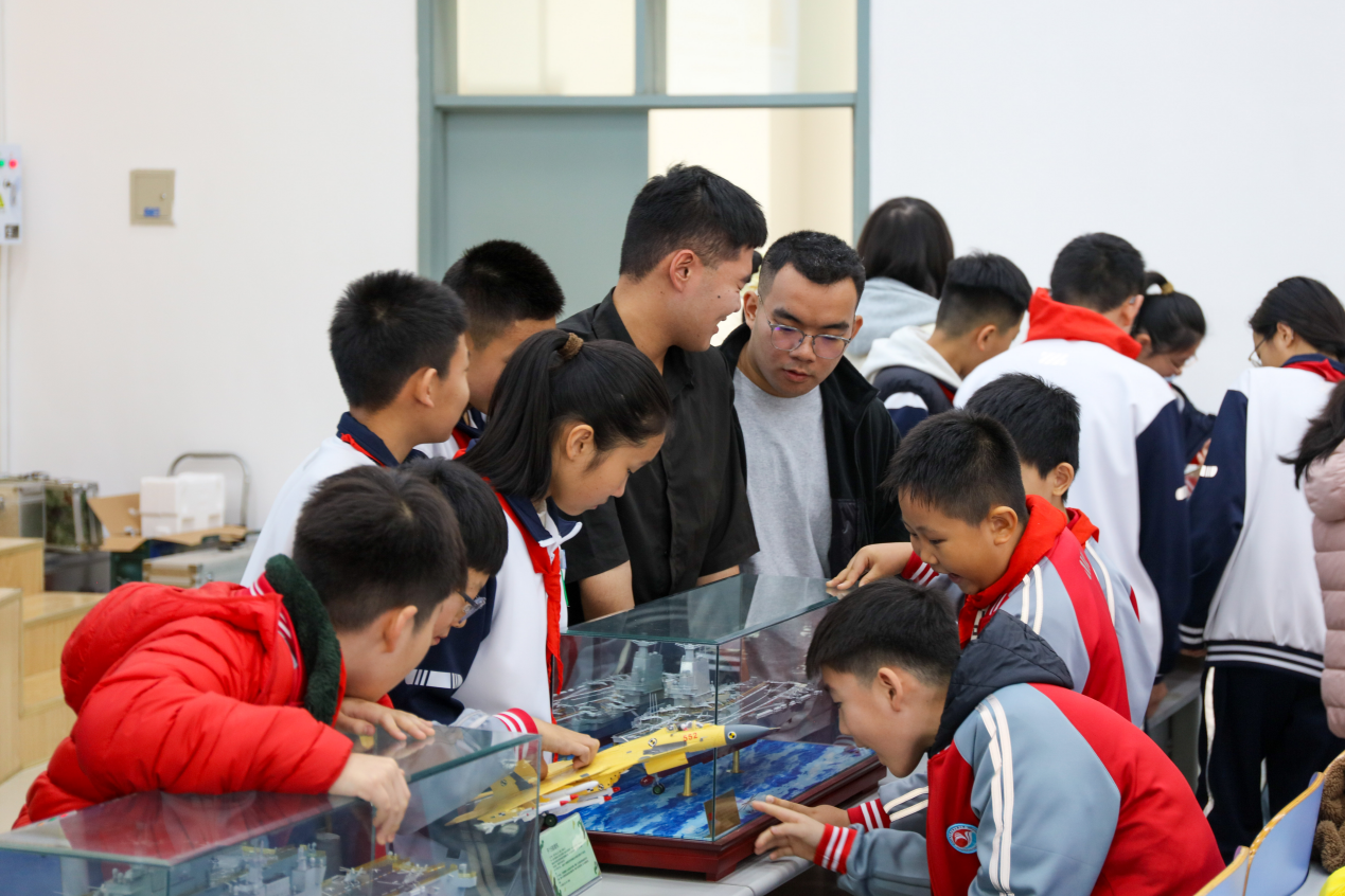 课程中场休息期间,会场前排陈列的我国先进军事装备模型吸引了众多学生驻足观看。从国产航母到新型战机,这些精密的教学模型不仅展现了我国国防科技的快速发展,也激发了同学们对国防现代化的浓厚兴趣,不同学段的学生在体验中增强了对国防建设的直观认知。