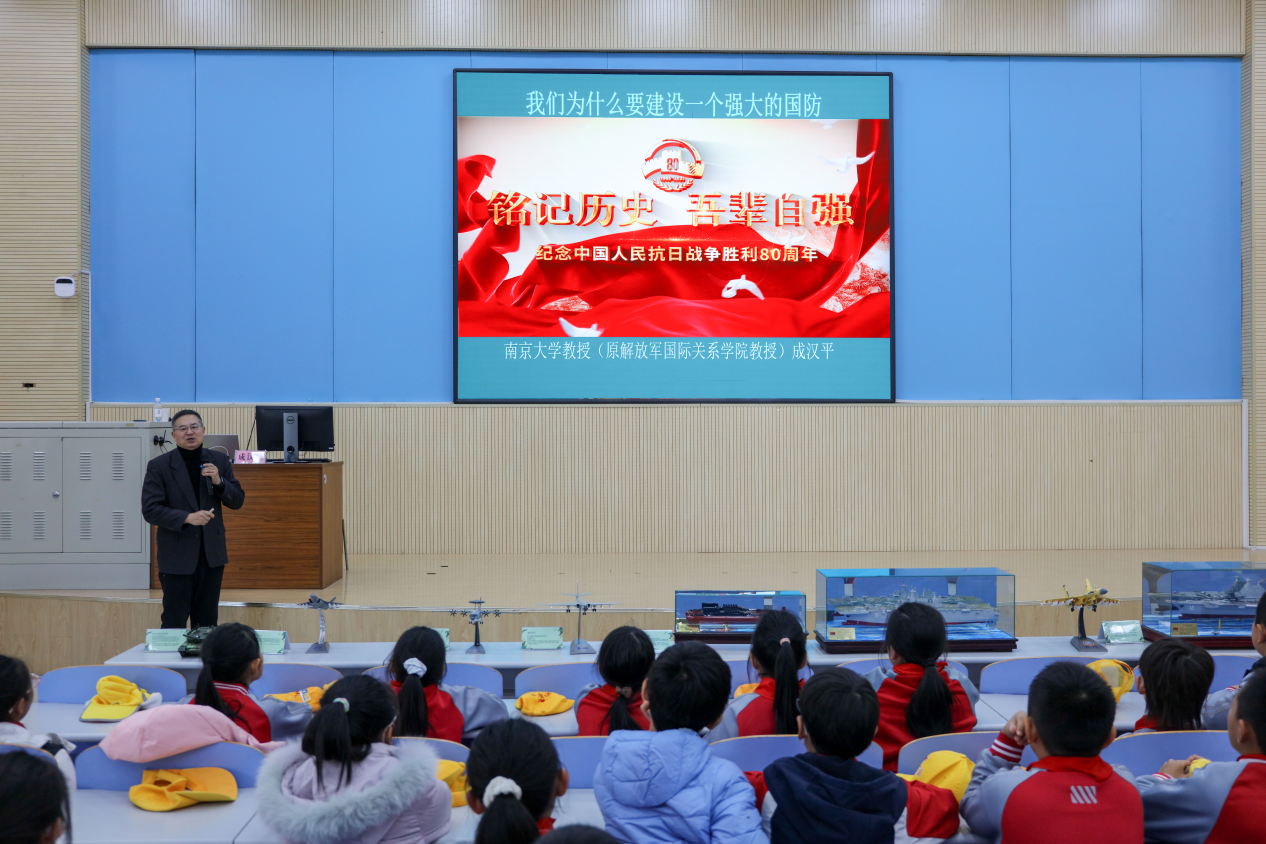 在本次思政大课中,成汉平教授以《铭记历史 吾辈自强》为主题,在抗战胜利80周年的历史节点回望,从历史纵深与现实关切的双重维度展开论述,为在场师生带来了一场生动的爱国主义教育。成教授首先通过丰富的历史资料回顾了抗战历程,用鲜活事例阐释了“落后就要挨打”的历史教训在当今时代的现实意义,强调要以客观态度对待历史,维护历史真相、反对歪曲历史事实。接着,他结合当前国际形势,分析了文化渗透和军国主义思想可能带来的危害,提醒师生要保持清醒认识、提高辨别能力。最后,他以九三大阅兵为例,系统阐述了国防建设对国家发展的重要作用,介绍了我国在国防领域取得的一系列成就,指出强大国防是维护国家主权和促进和平发展的重要保障。整场授课既立足历史又关照现实,内容层层递进,立意深远、逻辑严密,让不同学段的学生都能从中获得深刻启迪。
