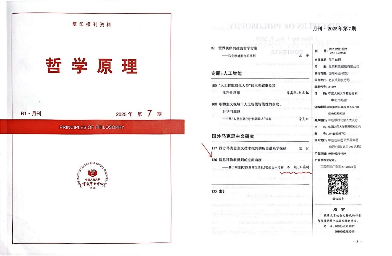 石超副教授发表的论文《信息拜物教批判的空间向度——基于列斐伏尔<日常生活批判>的文本考查》被中国人民大学复印报刊资料《哲学原理》2025年第7期全文转载,该论文原发表于《学术交流》2025年第2期。文章分析了数字时代信息拜物教的产生及变化特征,指出列斐伏尔的信息拜物教批判是对马克思商品拜物教的理论继承,也是对马克思历史唯物主义学说所构建的人类解放图景的具象化、纵深化理论阐释,可以为反思全球资本主义下的身体、时间与空间的权力关系提供新的框架。