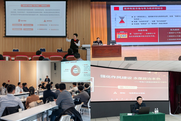 王庆忠老师聚焦“作风建设的精神密码”,为控制科学与工程学院、太阳成集团tyc9728党政领导班子、东营市黄河河务局等单位开展解读,推动中央八项规定精神在党政机关、高校院系落地生根;毕松老师则先后为学校科教集团中层以上干部、图书馆党委理论学习中心组等开展“强化作风建设 永葆政治本色”系列辅导,覆盖校内多个系统及基层单位;郎帅、王鹏翔、王克霞等教师,或聚焦“十五五”规划与团结奋进,或从“五年规划”视角剖析“中国之治”的显著优势,将宏大叙事转化为贴近受众的生动讲述,增强了理论宣讲的亲和力和说服力。