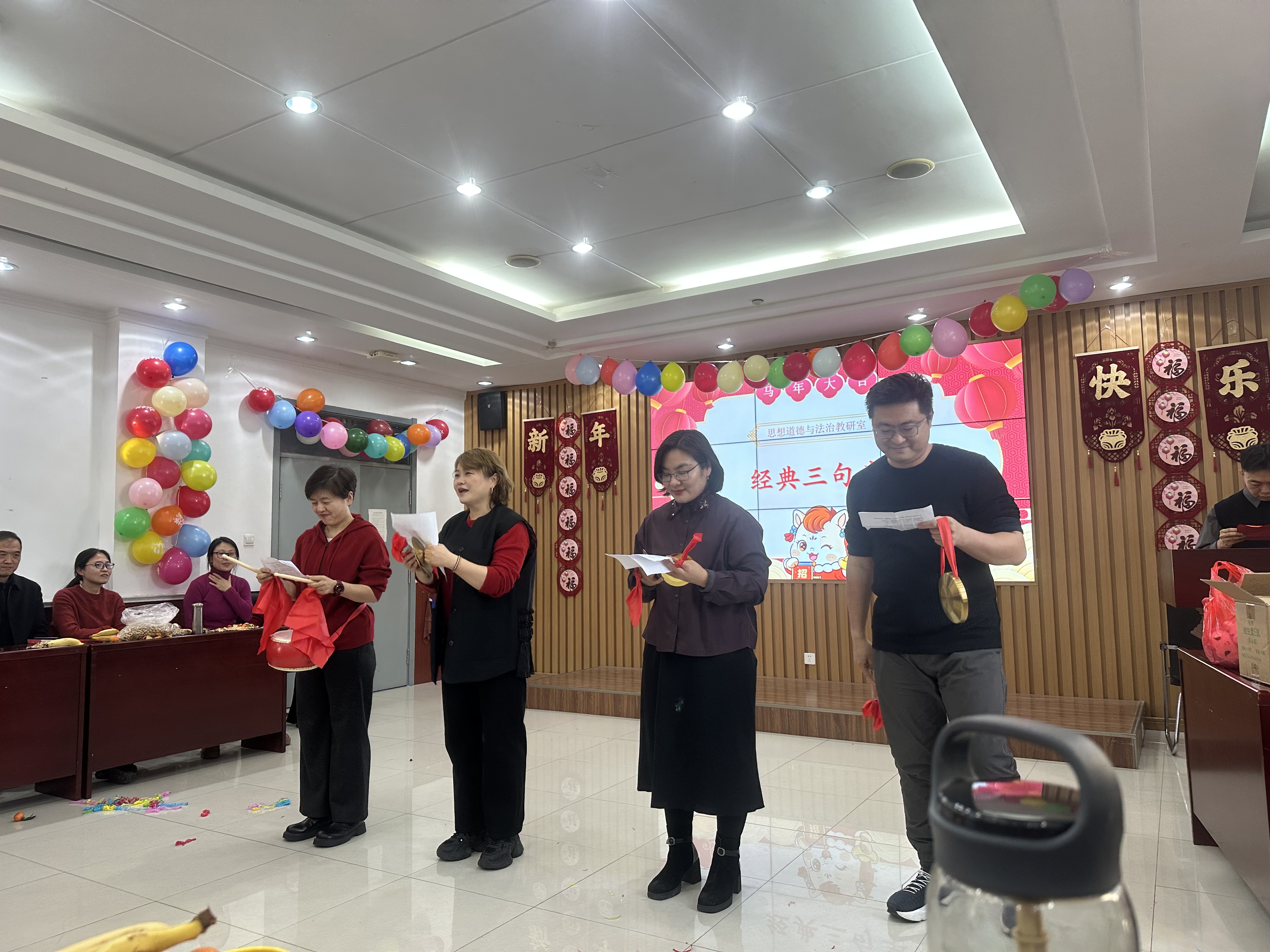 总结大会落下帷幕后,迎新春联欢会正式拉开帷幕。整场联欢会节目形式多样、精彩纷呈,由学院教职工自编自导自演,充分展现了教职工们多才多艺的一面与蓬勃向上的精神风貌。开场舞蹈《串烧》活力满满,舞姿翩翩,瞬间点燃现场气氛;创意表演《三句半》通过节奏鲜明的对白和生动的舞台表现,赢得了现场阵阵掌声;歌曲《朋友》《上春山》《明天会更好》以温暖治愈的旋律传递美好期许;诗朗诵《我是老师,我爱上课》《可爱的中国》《奋进新时代、马院绽芳华》紧扣工作生活,抒发了教育工作者的初心与担当。教职工们踊跃参与、默契配合,在欢声笑语中增进了情谊、凝聚了人心。